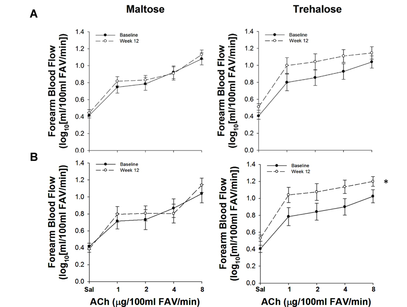 Resistance and conduit artery EDD are impaired with advancing age and are independent predictors of incident CVD [25-27]. As such, resistance and conduit artery endothelial dysfunction represent an intermediate phenotype in CVD progression [1, 2]. In the present study, there was no change in resistance artery EDD, as assessed by FBF to intra-arterial ACh, within the overall study population. However, resistance artery EDD improved ∼30% following 12 weeks of oral trehalose supplementation in subjects who maintained their body mass within 2.3 kg, suggesting that this intervention is effective for subjects who are able to maintain their baseline body mass despite the caloric content associated with the intervention. The increase in resistance artery EDD with trehalose supplementation was abolished by inhibition of endothelial NO production, indicating that this improvement was NO mediated. In contrast, maltose had no effect on resistance artery EDD or NO bioavailability. These findings are consistent with recent reports that trehalose has vascular-protective effects in age-related disease states in rodents [15, 17]. Moreover, these findings extend recent preclinical observations from our laboratory that oral trehalose supplementation improves NO-mediated EDD in response to ACh in old mice [19], and suggests that trehalose may be a viable therapy for the improvement of resistance artery EDD in MA/O adults.