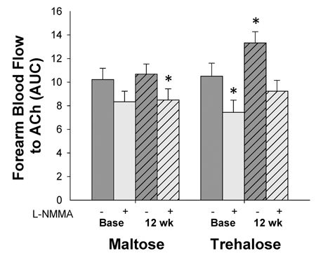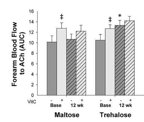 Forearm blood flow (FBF) values were log transformed to conform to normality assumptions; area under the dose-response curve (AUC) was calculated from the transformed values. FBF to brachial artery infusion of acetylcholine (FBFACh AUC) did not differ between groups at baseline (P=0.90) and did not change differentially across the intervention period with maltose and trehalose supplementation (F[1,23]=2.03, P=0.17).