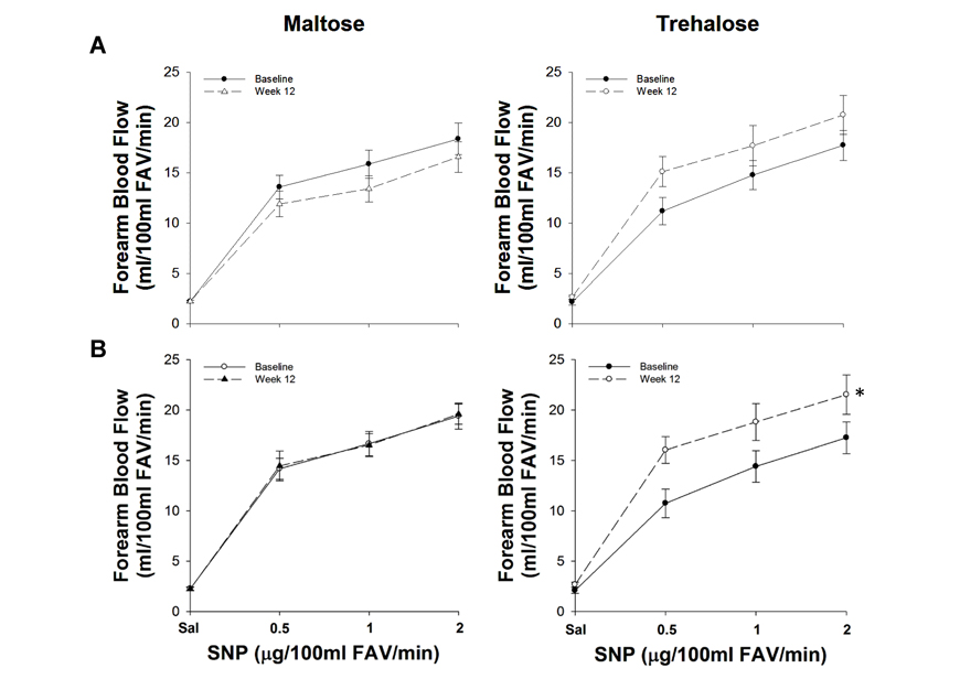 FBF to sodium nitroprusside (FBFSNP), a measure of smooth muscle sensitivity to NO, did not differ between groups at baseline (P=0.12). In all subjects, there was a trend for FBFSNP to change differentially following 12 weeks of maltose and trehalose treatment (F[1,23]=3.18, P=0.09).