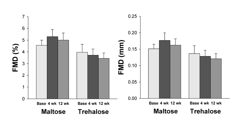 Brachial artery flow-mediated dilation (FMD) was similar between groups at baseline (FMD (mm): P=0.60; FMD (%Δ): P=0.41). FMD did not change differentially across the intervention in the trehalose and maltose treated groups when FMD was expressed as either percent or absolute change (both P>0.1, Figure 6). In contrast to resistance artery EDD, the change in FMD after 4 and 12 weeks of supplementation was not related to changes in body mass at these time points (all P>0.1). Moreover, group randomization was not an independent predictor of the change in FMD from baseline to week 4 or baseline to week 12 when holding body mass constant using multiple linear regression (all P>0.1).
