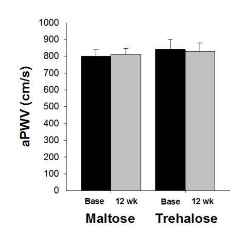 Aortic large elastic artery stiffness as assessed by aortic pulse wave velocity (aPWV) was not different between maltose and trehalose groups at baseline (P=0.56). There was no effect of time on aPWV (P=1.0) and aPWV did not change differentially across the intervention period in the trehalose and maltose groups (F[1,27]=0.31, P=0.59, Figure 7).