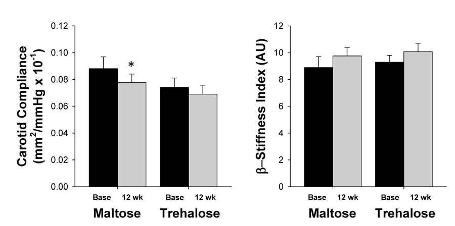 There were no baseline group differences in either carotid compliance (CC) or β-stiffness index (both P>0.1). CC changed significantly across the intervention period (F[1,26]=9.21, P=0.01) and this response did not differ between groups (F[1,26]=0.78, P=0.39). However, the change in CC with time was driven primarily by a decline in CC with maltose supplementation (0.078±0.006 vs. 0.088±0.009 mm2/mmHg × 10−1, P=0.03) as there was not a significant within-group change in CC with trehalose (P=0.12, Figure 8). This decline in CC with maltose treatment was likely due to the trend for increased PP observed in this group (Table 1), as no differences in β-stiffness index, a less blood pressure dependent measure of large elastic artery stiffness, was observed with either trehalose or maltose supplementation (both P>0.1, Figure 8). There was no relation between the change in body mass from baseline to week 12 and the change in either CC or β-stiffness index.