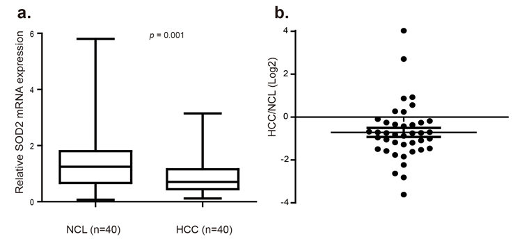 Altered SOD2 level has been reported in several cancer types, but the pattern is complex with down-regulation in some tumors but up-regulation in others. Thus far, SOD2 expression has not been investigated in HCC. Given the importance of SOD2 in mitochondrial integrity and liver biology, we investigated SOD2 expression in HCC. To this end, SOD2 mRNA level was analyzed in 40 pairs of human primary HCC and matching adjacent non-cancerous liver (NCL) tissues by RT-qPCR. SOD2 mRNA expression was found to be significantly reduced in 30 of 40 tumors, representing 75% of the HCC tissues compared with the NCL tissues (p = 0.001, Fig. 1a and 1b). In tumors with SOD2 down-regulation, SOD2 expression was reduced by as much as 12-fold, with the median decrease nearly 2-fold (Fig. 1b).