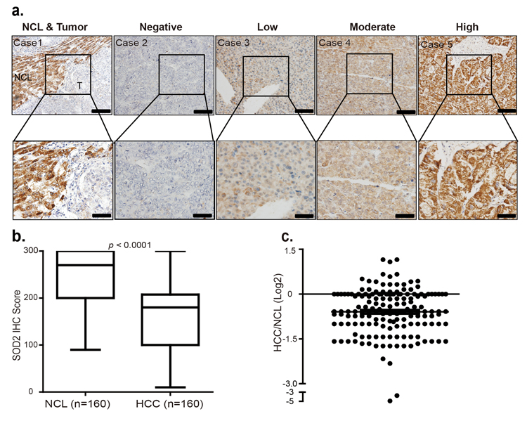 To verify this finding, we investigated SOD2 protein expression by immunohistochemistry (IHC) staining of a large cohort of 160 paraffin-fixed human primary HCC tumors and matching adjacent NCL tissues. Based on the study of genomic mRNA expression profiling in different mouse tissues [31], liver is one of the tissues where SOD2 is highly expressed in mice (Fig. S1). Consistently, SOD2 was found to be abundant as indicated by strong IHC staining in most of the NCL tissues (Fig. 2a). However, in tumor tissues, SOD2 protein expression showed considerably variations, ranging from negative, low, moderate to high IHC staining (Fig. 2a). Quantification of SOD2 staining IHC scores confirmed that SOD2 is indeed significantly decreased in HCC tissues as compared with their matched NCL tissues (p < 0.001, Fig. 2b). SOD2 protein expression was found to be largely reduced in 111 of 160 (69%) patients HCC tissues compared with the NCL tissues (p < 0.0001, Fig. 2b and 2c). In these 111 patients' HCC tissues, SOD2 expression was reduced by as much as 30-fold, with the median decrease 1.67-fold (Fig. 2c). Together, these results show that SOD2 expression is reduced at both mRNA and protein level in HCC.