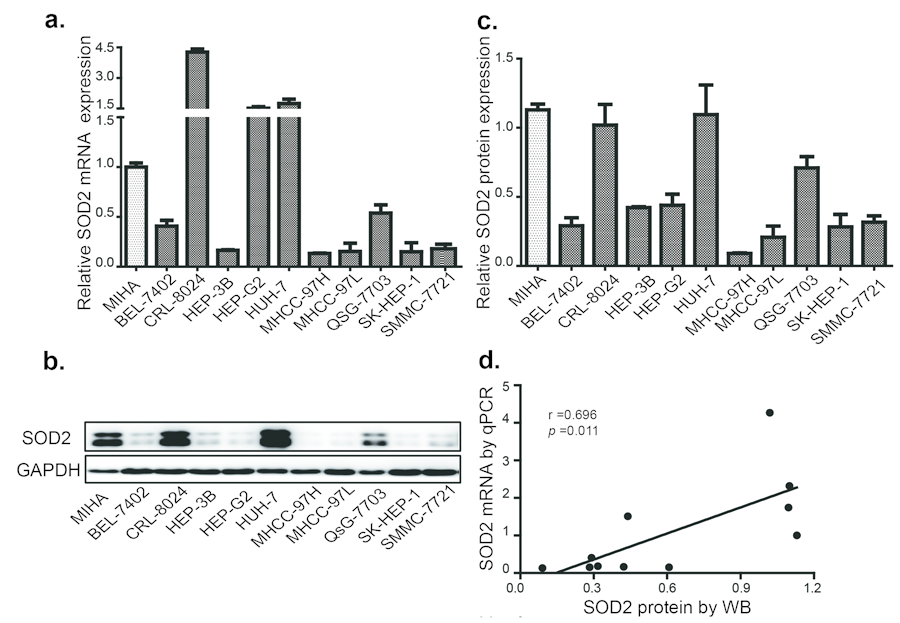 Total RNA was extracted from the aforementioned cell lines and snap-frozen HCC/NCL tissues using the TRIzol reagent (Invitrogen, 15596-018, USA) according to the manufacturer's instruction. Two-step RT-qPCR was performed to assess the mRNA level of SOD2 as previously described [46]. First strand cDNA was synthesized by GoScript™ reverse transcriptas and random primers (Promega, A5001, Madison, WI, USA). cDNA was quantified in triplicate by GoTaq® qPCR Master Mix (Promega, A6001, Madison, WI, USA) on Roche LightCycler480(Roche, Basel, Switzerland). GAPDH was used as an internal control. Relative SOD2 mRNA expression was presented by 2−ΔΔCT method. Paired primer sequences used for SOD2 are: 5′-GACAAACCTCAGCCCTAACG-3′ (forward) and 5′-GAAACCAAGCCAACCCCAAC-3′ (reverse); for GAPDH: 5′-TGCACCACCAACTGCTTAGC-3′ (forward) and 5′-GGCATGGACTGTGGTCATGAG-3′ (reverse).
