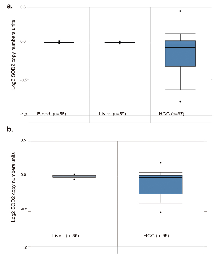 To understand the relationship between SOD2 mRNA and protein expression in HCC, we analyzed a panel of 10 HCC cell lines and an immortalized human hepatocyte cell line by RT-qPCR and Western blotting. Compared with the immortalized hepatocyte cell line MIHA, SOD2 mRNA was found to be lower in 7 of the 10 HCC cell lines (Fig. 3a), and protein level was lower in 8 of 10 HCC cell lines (Fig. 3b and 3c). The mRNA and protein level are largely correlated with each other (Fig. 3d), suggesting that SOD2 mRNA abundance is the primary determinant of SOD2 expression. However, there are some exceptions. Specifically, although SOD2 mRNA in HepG2 cells was higher than MIHA cells, SOD2 protein level was actually lower in HepG2 cells. QSG-7703 showed decreased SOD2 mRNA but not protein compared with MIHA cells. Thus, translational and post-translational mechanisms are likely to be involved in these cases. To understand the mechanism for altered SOD2 mRNA expression, we analyzed SOD2 copy number changes in one cohort of 97 HCC, 59 normal liver and 57 blood samples from the TCGA cancer genomic database (http://cancergenome.nih.gov). There was a pronounced decrease in SOD2 copy number in HCC versus blood and normal liver samples (Fig. 4a). Essentially the same phenomenon was observed with another cohort of 99 HCC and 86 normal liver samples obtained from the Oncomine genomic database (Fig. 4b) [32]. These observations indicate that loss of SOD2 locus is a mechanism for the decrease in SOD2 mRNA expression in HCC.