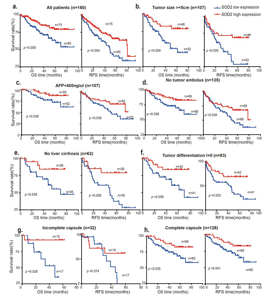 To investigate the prognostic value of SOD2 protein expression, univariate analysis of SOD2 protein level and clinicopathological features was carried out using the Cox proportional hazard model. The result shows that low SOD2 protein expression (p = 0.005), higher serum AFP (p = 0.002), larger tumor size (p = 0.010), multiple tumors (p < 0.001), tumor embolus (p = 0.004) advanced TNM (p = 0.001) and BCLC stage (p < 0.001) are predictors for poor OS of HCC patients (Table 2). On the other hand, low SOD2, higher Serum AFP, tumor embolus, multiple tumors, advanced TNM, BCLC, and postoperative metastasis were statistically significantly correlated with shorter RFS in HCC patients (Table 2). To determine if SOD2 low expression can be an independent prognostic factor, multivariate Cox regression was further performed on those variables significantly associated with poor survival of HCC patients. The results demonstrate that low SOD2 protein expression is indeed an independent predictor for poor OS (HR = 2.310, 95% CI = 1.031-5.178, p = 0.042) and RFS (HR = 1.809, 95% CI = 1.037-3.156, p = 0.037) in patients with HCC (Table 2), suggesting that SOD2 protein is a useful prognostic biomarker for HCC patients.