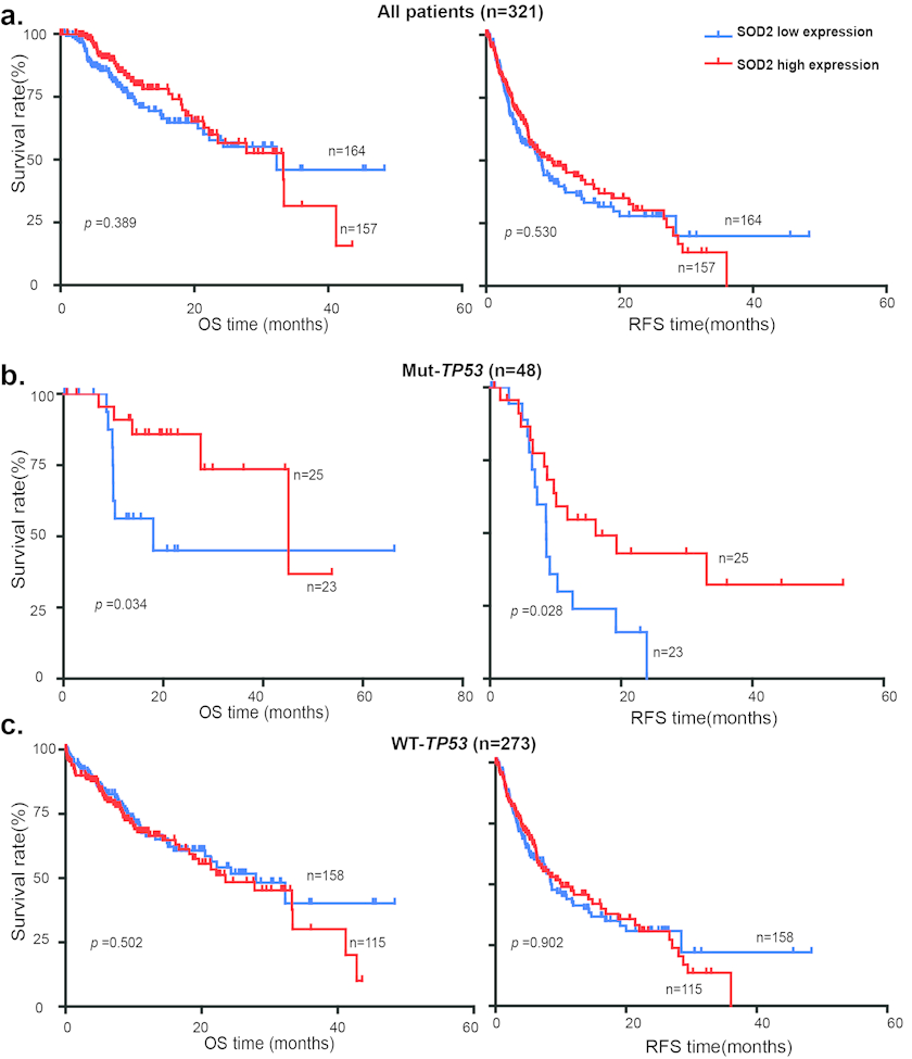 The tumor-suppressor p53 plays an important role in oxidative stress response. It has been shown that SOD2 is a p53 target gene at the transcriptional level: p53 normally binds to SOD2 promoter and represses SOD2 transcription [33], but activates SOD2 expression during oxidative stress [34]. Because TP53 is frequently mutated in liver cancer, we investigated the relationship between TP53 mutations and SOD2 expression in the survival of HCC patients using genomic and clinical data from cBioPortal for Cancer Genomics (http://www.cbioportal.org). HCC patients were divided into the SOD2 high expression and low expression subgroups using the median SOD2 mRNA value of 12645.314 as the cutoff. Kaplan-Meier and the log-rank test analysis showed that differential SOD2 mRNA expression is not statistically significantly correlated with patient survival in this cohort of HCC patients (Fig. 6a). We therefore further divided HCC patients into wild type and mutant TP53 subgroups. Strikingly, low SOD2 mRNA expression is associated with much shorter OS (p < 0.034) and RFS (p < 0.028) in HCC patients carrying the mutant TP53, but not the wild type TP53 (Fig. 6b). These results suggest that low SOD2 expression alters the mortality of this HCC patient population in a p53-dependent manner.