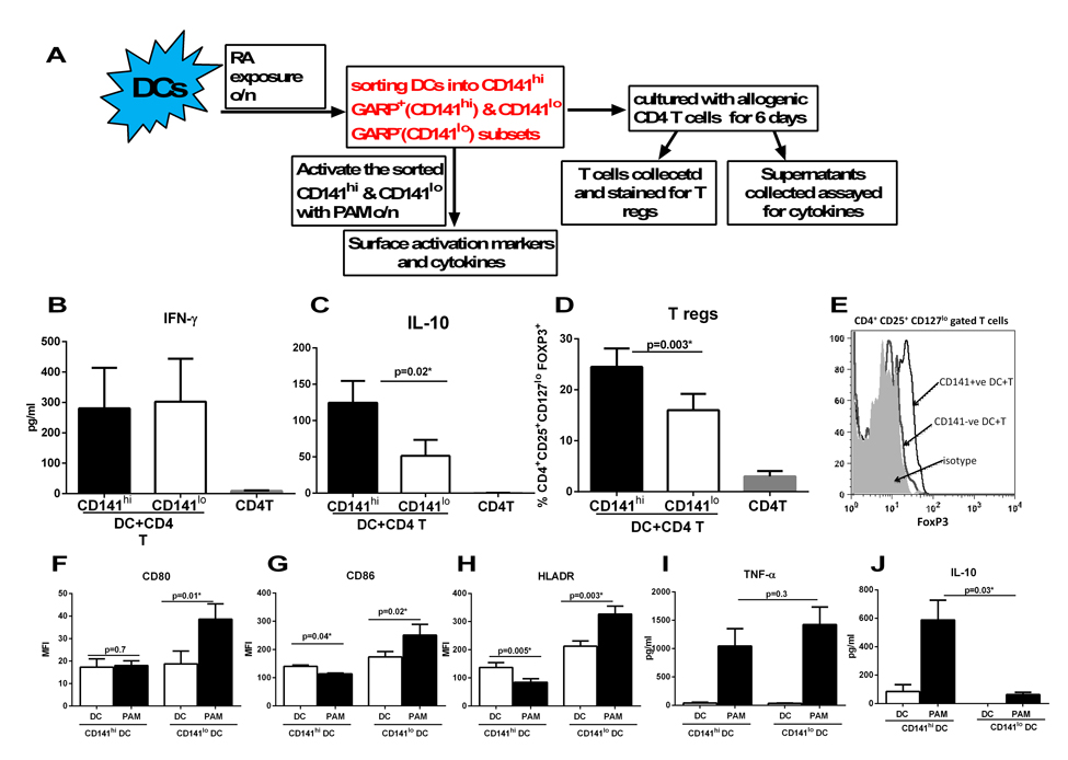 Exposure to RA led to the upregulation of CD141 and GARP on DCs. These DCs also induced increased T regs. Furthermore, the upregulation of CD141 and GARP as well as generation of T regs were both compromised in RA exposed DCs from aged subjects. Recent reports from the literature also suggested that CD141 may be anti-inflammatory [30, 31]. In addition, GARP is already associated with tolerance on T cells. Therefore, we explored whether there was a correlation between the two phenomena by determining the cytokine secretion and T reg induction capacity of CD141 and GARP+ DCs. Next, we purified CD141 high, GARP+ (hereafter referred to as CD141hi) and CD141low, GARP− (hereafter referred to as CD141lo) DC populations. Purified CD141hi and CD141lo DCs were subsequently cultured with CD4+T cells and secretion of IFN-γ and IL-10 and generation T regs was determined as described. Figure 4A depicts the flow chart for the experimental set up in this figure. Culture of both CD141hi and CD141lo DCs with T cells resulted in comparable levels of IFN-γ secretion (Figure 4B), however, the secretion of IL-10 from T cells was significantly (p<0.05) increased in CD141hi DC group compared to CD141lo DCs group (Figure 4C). CD141hi DCs also induced significantly (p<0.05) higher percentages of T regs compared to CD141lo DCs (Figure 4D & E).