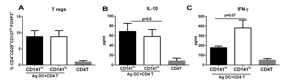 Together, these data suggest that though the CD141hi DCs from aged subjects display impaired capacity to induce Tregs and IL-10 compared to young; nevertheless, they do possess some degree of anti-inflammatory capacity since the secretion of IFN-γ is reduced from T cells cultured with CD141hi DCs from aged individuals.