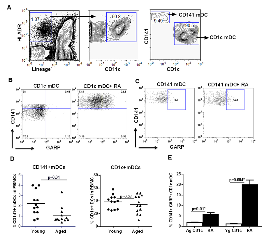 Next, we compared the response of mDCs from aged and young individuals to RA. Interestingly, reduced expression of CD141 on DCs in aged seemed to be universal since when we compared the percentages of CD1c+ and CD141+ mDC subsets in the circulation of aged and young subjects, there was a significant (p<0.05) reduction in the percentage of CD141+mDC subset in the elderly compared to the young subjects (Figure 6D). The percentage of CD1c+ mDC subset on the other hand was comparable between the two age groups. Further experiments therefore focused only on CD1c+ subset. Similar to monocyte derived DCs, CD1c+ mDC from aged individuals also displayed reduced expression of CD141 and GARP compared to DCs from the young, on exposure to RA (Figure 6E).