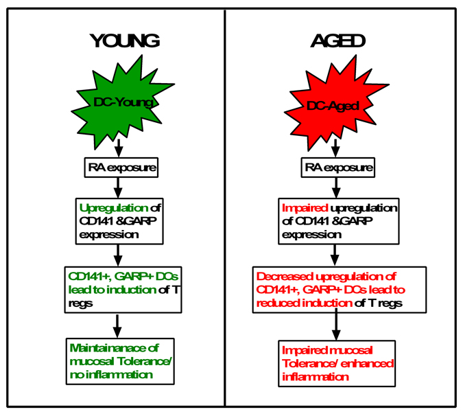 In conclusion (Figure 7), compared to young, DCs from aged display a deficiency in their response RA. There is impaired upregulation of CD141 and GARP on RA-stimulated DCs from aged individuals. The diminished expression of CD141 and GARP results in a decreased capacity of aged DC to induce Tregs. Our results there-fore suggest a novel mechanism that can cause severe and chronic inflammation in mucosa of the elderly, thus enhancing their susceptibility to mucosal infections and diseases. To our knowledge this the first report of RA inducing the expression of CD141, GARP on DCs and the effect of age on the response of DCs to RA.
