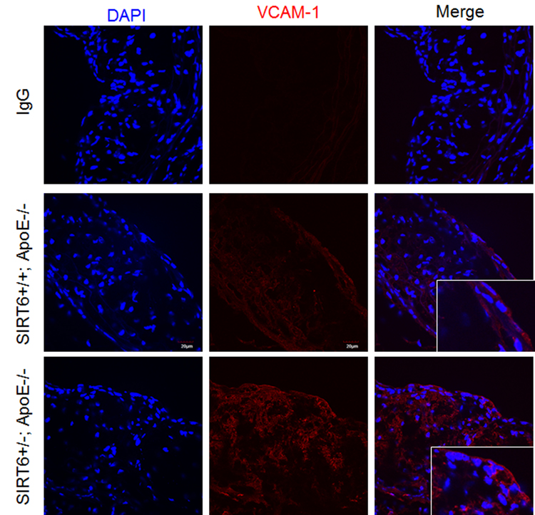 Endothelial cell adhesion molecules, such as vascular cell adhesion molecule-1 (VCAM-1), play an important role in atherogenesis by promoting monocyte adhesion to inflamed endothelium [7, 45]. Thus we examined the effect of SIRT6 deletion on VCAM-1 expression in aortic sinus. We observed that VCAM-1 was increased in atherosclerotic plaques of SIRT6+/−; ApoE−/− compared with SIRT6+/+; ApoE−/− mice (Figure 5). These results indicate that SIRT6 prevents adhesion molecule VCAM-1 expression.