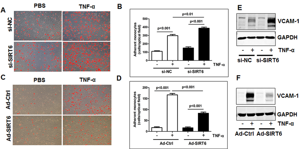 To further understand the molecular mechanisms of SIRT6-mediated atheroprotection, we evaluated the effect of loss- and gain-of SIRT6 function on tumor necrosis factor alpha (TNF-α)-induced monocyte adhesion to ECs. HUVECs were transfected with SIRT6 siRNA for 48 h, or infected with SIRT6 adenovirus (the multiplicity of infection or M.O.I. 10) for 24 h (Figure S4). We then evaluated the effect of SIRT6 depletion and overexpression on monocyte adhesion to ECs. As shown in Figure 6A-D, the number of adhering human THP-1 monocytes to HUVECs was significantly increased (by 30%, P<0.01) by SIRT6 siRNA treatment and decreased (by 50%, P<0.001) by SIRT6 overexpression. Further studies of the mechanisms whereby SIRT6 inhibits monocyte adhesion showed that SIRT6 inhibited monocyte adhesion by decreasing TNF-α-induced expression of VCAM-1 in ECs (Figure 6E-F).