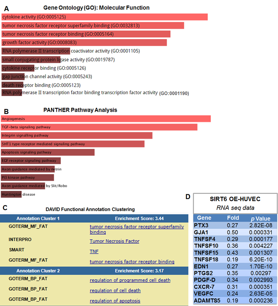 Overrepresentation analysis of these genes using Enrichr database [33] revealed that the top three significantly overrepresented molecular function GO terms were cytokine and TNF-α receptor (superfamily) binding (Figure 7A). PANTHER pathway analysis suggests that SIRT6 modulates several important pathways in ECs, including angiogenesis, TGF-β signaling and integrin signaling (Figure 7B). To investigate the enrichment of functional annotation, we used Database for Annotation, Visualization and Integrated Discovery (DAVID) [34] to examine the 198 genes downregulated by SIRT6 overexpression. The functional annotation clustering results suggests that the top two DAVID-defined clusters which displayed enrichment scores (ES) >3 under high classification stringency parameters were: TNF-α receptor (super-family) binding and cell death (Figure 7C). Detailed analysis of RNA-seq data indicated that SIRT6 overexpression decreased the expression of multiple genes involved in vascular inflammation and atherosclerosis, including PTX3 (Pentraxin 3) [35], GJA1 (gap junction A1, also known as Connexin 43) [36], and TNFSF4 (tumor necrosis factor superfamily member 4, also known as OX40 ligand) [37] (Figure 7D and Table S4). In addition, SIRT6 overexpression upregulates several heat shock protein (HSP) genes that participate in DNA damage repair, including HSPA1A (Heat shock 70 kDa protein 1, also termed Hsp72), HSPA1B, and HSPA6 (Table S5).