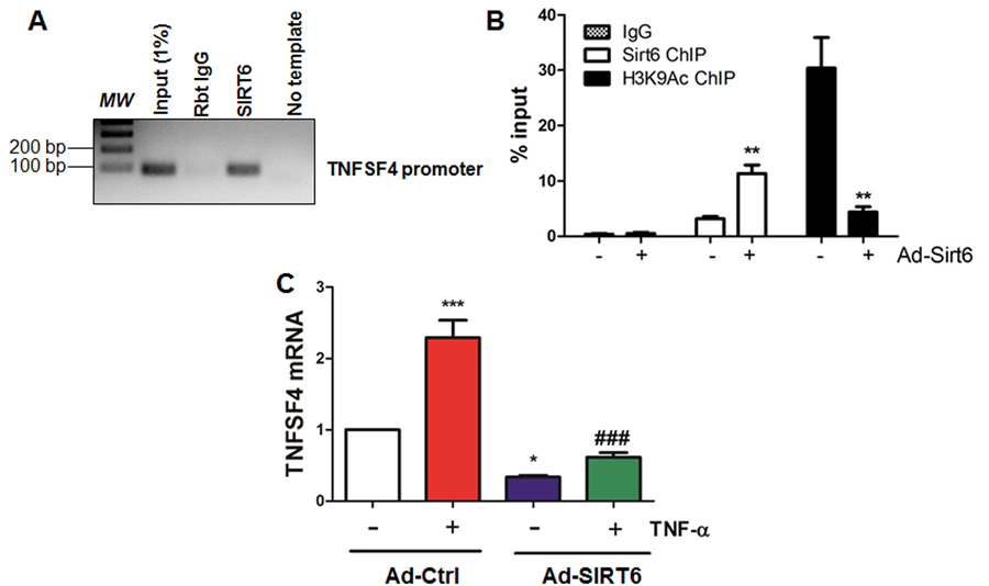 SIRT6 exerts its activity by deacetylating H3K9 [38, 39], H3K18 [40] and H3K56 [41, 42] at gene promoters. Particularly, SIRT6 attenuates NF-κB signaling by deacetylating H3K9 in the promoter region of NF-κB target genes including VCAM-1 [39]. To further validate whether TNFSF4, a critical atherosusceptible gene [37] associating with NF-κB pathway [43], is regulated by SIRT6, we performed chromatin immunoprecipitation (ChIP) assay. Our results indicate that SIRT6 binds to promoter region of TNFSF4 under basal conditions (Figure 8A), which was increased upon infection with SIRT6 adenovirus. However, the level of H3K9Ac binding to the TNFSF4 promoter region was significantly decreased by SIRT6 overexpression (Figure 8B). We next assessed mRNA expression of TNFSF4 in the presence or absence of TNF-α treatment. Real-time PCR analysis revealed that SIRT6 overexpression significantly reduced TNFSF4 expression under basal conditions and TNF-α stimulation (Figure 8C). These data suggest that SIRT6 decreases TNFSF4 expression by deacetylating H3K9 at TNFSF4 gene promoter.