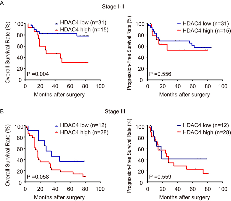 We further stratified ESCC patients by different TNM stage. The results show that stage I-II patients with high level of HDAC4 mRNA have remarkably poorer OS than those with low level (Supplementary Fig. 1A left panel), and stage III patients with high HDAC4 level have marginally significantly shorter OS than those with low level (Supplementary Fig. 1B left panel). It should be noted that the latter is likely to be due to the small sample size. No significant difference is seen between PFS of patients with high and low HDAC4 expression in both stage I-II and stage III subgroups.
