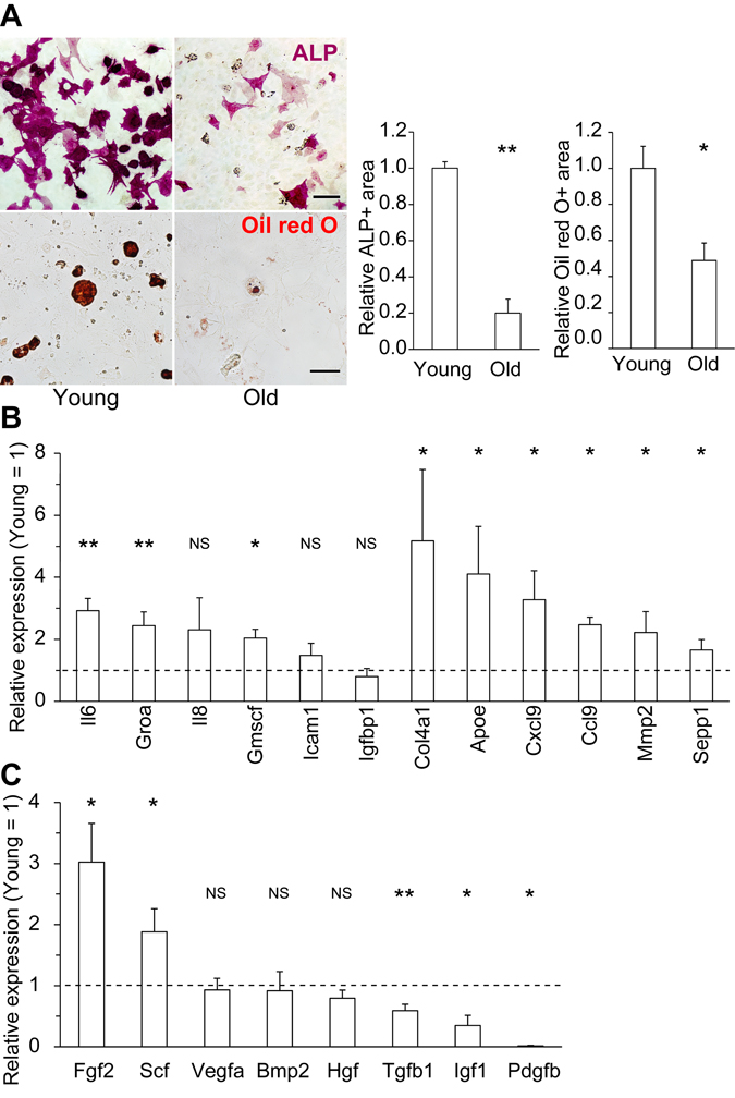 Aging of adult tissue stem cells also contributes to loss of tissue homeostasis, e.g., dysregulation of hematopoiesis due to a decline in the lymphopoietic potential of hematopoietic stem/progenitor cells (HSCs) [10, 11]; reduced muscle repair capacity due to diminished activity of skeletal muscle satellite cells [12-14]; and loss of multipotency (i.e., the potential to differentiate into osteogenic, adipogenic, chondrogenic, neurogenic, and myogenic lineages) of mesenchymal stem/stromal cells (MSCs). Previous studies showed that regenerative efficacy is greater in young MSCs than in old MSCs [15-17]. Moreover, the expression of growth factors declines with age [18, 19], and secretory factors exert different effects on MSC function in young vs. old MSCs [16, 20]. These reports suggest that age-dependent changes in secretory properties are induced in MSCs, although to date the MSC SASP remains uncharacterized.