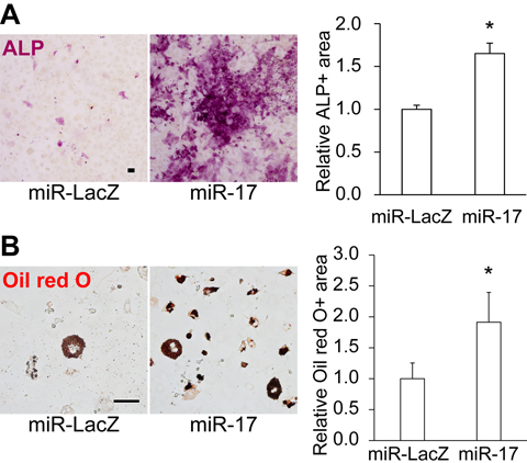 Although miR-17 is known to exert both pro- and anti-osteogenic effects on osteoblast differentiation of MSCs [28-30], the role of miR-17/106 in regulating the differentiation potential and secretory phenotype of undifferentiated MSCs remains unclear. To address this issue, we transduced old MSCs with miR-17 lentivirus, which integrates the transgene into the genome of the infected cell and continuously overexpresses EGFP and miR-17 under the control of the human elongation factor-1α promoter, and cultured them for 1 week, and retrospectively evaluated differentiation potential by measuring the area that stained positive for alkaline phosphatase (ALP) in osteoblasts and Oil red O in adipocytes. In cells overexpressing miR-17, osteogenic and adipogenic potential was significantly restored (Fig. 2A–B).