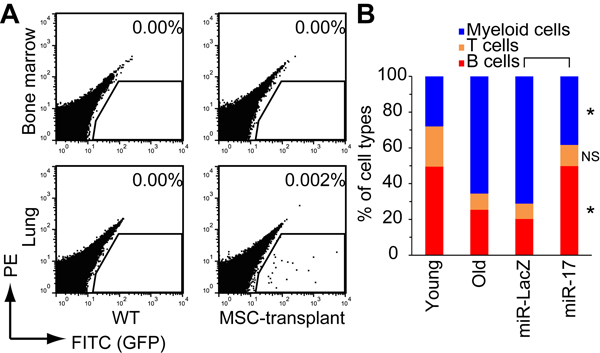 MSCs isolated from young and old mice were lentivirally transduced and intravenously transplanted into old mice as previously described [15]. The percentages of PB cell types (B220+ B cells, CD3ε + T cells, and CD11b+ myeloid cells) were analyzed by FACS using specific antibodies (BioLegend). After sacrifice, cells were prepared from BM, lungs, liver, and spleen using dispase/collagenase solution, and then analyzed by FACS to monitor MSC engraftment.