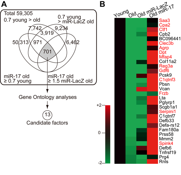 To identify the MSC-derived secretory factors responsible for restoring lymphopoiesis, we used microarrays to compare the gene expression profiles of young, old, and miR-17-overexpressing old MSCs. Genes whose expression was downregulated in old MSCs but restored by miR-17 overexpression were subjected to Gene Ontology analysis, revealing 13 candidate secretory factors (Fig. 4, Supplementary Table 4, and also see Methods).