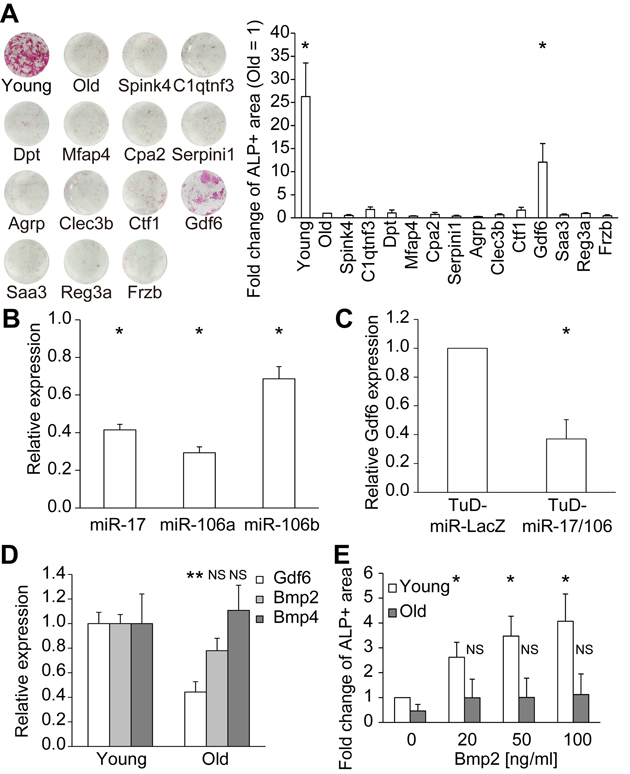 We functionally analyzed these 13 candidate factors in MSC osteoblast differentiation assays. For this purpose, each factor was expressed in 293T cells, and the conditioned medium (CM) was collected. Differentiation of old MSCs into osteoblasts was induced by osteogenic differentiation media supplemented with or without 50% CM. Among the 13 candidate factors, only Gdf6 promoted osteogenic differentiation in old MSCs (Fig. 5A). Next, we investigated the dependency of Gdf6 expression on miR-17. To this end, we utilized RNA decoys, referred to as “tough decoy” RNAs (TuDs), to efficiently and stably suppress the activity of miR-17 and its paralogs miR-106a/b (Fig. 5B) [26, 32]. Repression of miR-17/106 induced downregulation of Gdf6, suggesting that expression of Gdf6 is regulated by miR-17 in MSCs (Fig. 5C).