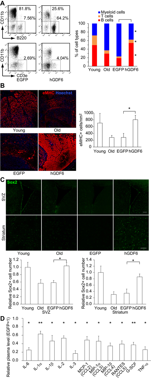 In addition, we examined the influence of hGDF6 overexpression on other geriatric pathologies. To investigate the effect on muscle repair capacity, we injured the tibialis anterior muscle by focal cardiotoxin (CTX) injection 5 days before sacrifice, and then monitored the formation of embryonic myosin heavy chain-positive (eMHC+) myoblasts. In addition to mononuclear myoblasts, large numbers of eMHC+ myotubes were observed in hGDF6-overexpressing mice, as demonstrated by an increase in the eMHC+ area (Fig. 6B and Supplementary Fig. 9A). These results suggest that continuous exposure to high doses of hGDF6 accelerates muscle regeneration. Moreover, in hGDF6-overexpressing old mice, Sox2-positive (Sox2+) neural progenitors were distributed in a wide brain region that included the subventricular zone (SVZ) and striatum concomitant with improvements in the cerebrovascular network; by contrast, relatively few Sox2+ cells were detected in the brains of old control mice (Fig. 6C and Supplementary Figs. 9B–C, 10). The number of Dcx+ neuroblasts was also increased in hGDF6-overexpressing old mouse brain (Supplementary Fig. 11). We also observed broad expression of Gdf6 both in young and old mouse brains, whereas little is known about its physiological functions in the brain (Supplementary Fig. 12). Furthermore, the plasma levels of various inflammatory factors were reduced in hGDF6-overexpressing mice (Fig. 6D). Taken together, these results indicate that Gdf6 is a regenerative factor secreted from MSCs.