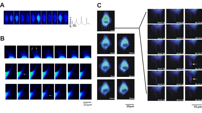 To determine whether A549 cancer cell migration is regulated by intracellular Ca2+ signalling, we first detected Ca2+ release events using confocal microscopy. A549 cells were loaded with Fluo-AM and confocal microscopy scanning images were collected (40×objective lens, 512×512 pixel, xy-t scan, 1 s/frame without intervals). As shown in Fig. 1A, spontaneous calcium transients were detected in A549 cells. However, no calcium signalling was found in the leading area (Fig.1B, as indicated by arrows) with a relatively low calcium concentration as reported in fibroblasts [4]. To determine the relationship between Ca2+ signalling and A549 cell migration, we constructed a calcium indicator protein GCaMPJ [17] that was stably expressed in the A549 cell line. A long-term (120 min) recording of A549 /GCaMPJ cell migration and the scanning images of Ca2+ signalling were recorded using the API live cell imaging system (60×objective lens, 512×512 pixels, xyt scanning, 5 s/frame). Spontaneous calcium transients were observed in the cells (Fig.1C). However, we did not identify any relationship between cell migration and the localization of Ca2+ signalling in A549 cells.