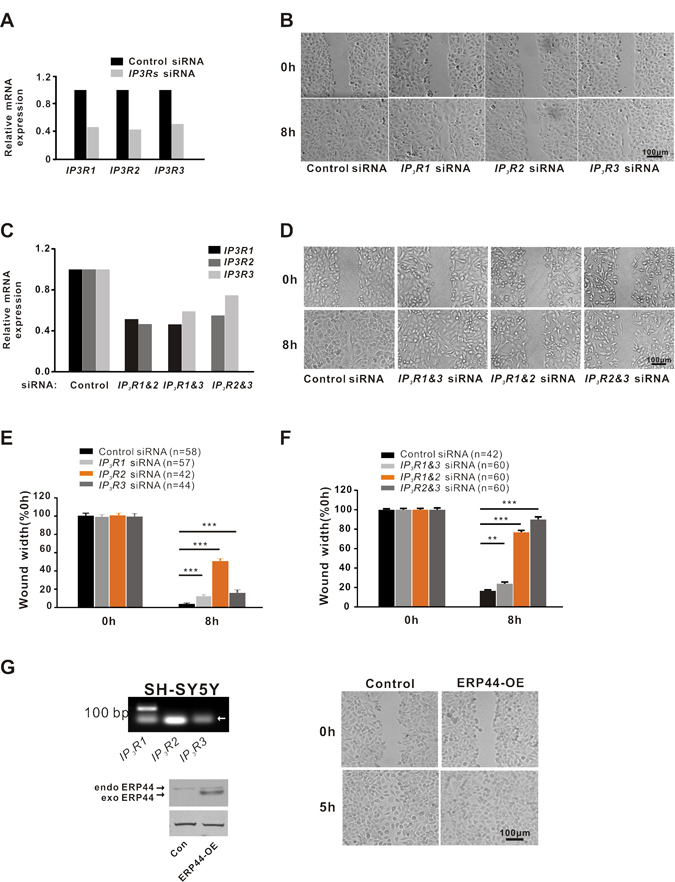 It has been reported that ERP44 inhibits intracellular Ca2+ release by binding to IP3R1 [15]. We confirmed that all three types of IP3R were expressed in A549 cells (Fig. 5A). However, the subtype of IP3Rs that mediates the inhibitory effect of ERP44 on A549 cell migration remains unknown. To clarify this, we performed RNA interference studies. We synthesized siRNAs for IP3R1, IP3R2 and IP3R3 according to a previously reported method [4] and the real-time PCR results indicated the interference efficiency of single IP3Rs siRNA to be >50% after transfection for 72 h (Fig. 5A). Wound-healing studies demonstrated that all types of IP3Rs exhibited a inhibition of wound healing of A549 cells compared to the control (Fig. 5B & E, p < 0.001 vs. control). However, among these receptors, IP3R2 displayed a remarkable inhibitory effect on A549 cell wound healing (Fig. 5B & E, p < 0.001 vs. IP3R1 and IP3R3). To further confirm, we carried out wound-healing studies with combined IP3Rs siRNA of >30% interference efficiency. As the Fig. 5D & F shown, wound healing in A549 cells with treatment involved IP3R2 siRNA was markedly inhibited while in A549 cells with IP3R1 and IP3R3 siRNA was mildly inhibited. These results suggested that IP3R2 plays a predominant role in mediating the inhibitory effect of ERP44 on A549 cell migration. Moreover, we performed scratch experiments in ERP44 stably transfected SH-SY5Y cells, which mainly express IP3R1 [20](Fig. 5G left-upper), indicated that the overexpression of ERP44 did not significantly inhibit cell migration, confirming that ERP44 inhibition of cell migration is independent of IP3R1 (Fig. 5).
