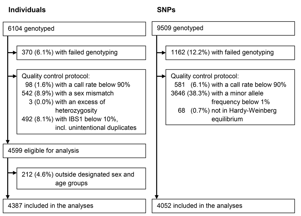 After genotyping, buccal samples and SNPs were subjected to a stringent quality control protocol. Of the 6104 individuals from whom buccal samples had been taken, we excluded 370 (6.1%) because of genotyping failure. Furthermore, we excluded 98 (1.6%) individuals with a call rate below 90%, 542 (8.9%) individuals with a sex mismatch, 3 (< 0.1%) individuals with an excess of heterozygosity indicated by an inbreeding coefficient below −0.3 or above 0.3, and 492 (8.1%) individuals with a different allele at less than 10% of the loci indicated by an IBS1 below 10%, which included unintentional duplicates. Of the 4599 individuals eligible for analysis, 212 (4.6%) individuals outside the designated sex and age groups were excluded. Of the 9509 genotyped SNPs, we excluded 1162 (12.2%) because of genotyping failure. Furthermore, we excluded 581 (6.1%) SNPs with a call rate below 90%, 3646 (38.3%) SNPs with a minor allele frequency below 1%, and 68 (0.7%) SNPs that were not in Hardy-Weinberg equilibrium. As a result, 4387 individuals and 4052 SNPs were included in the analyses. Of these SNPs, 98 (2.4%) were evolutionarily neutrally selected controls. The exclusions and inclusions are described in Figure 1.