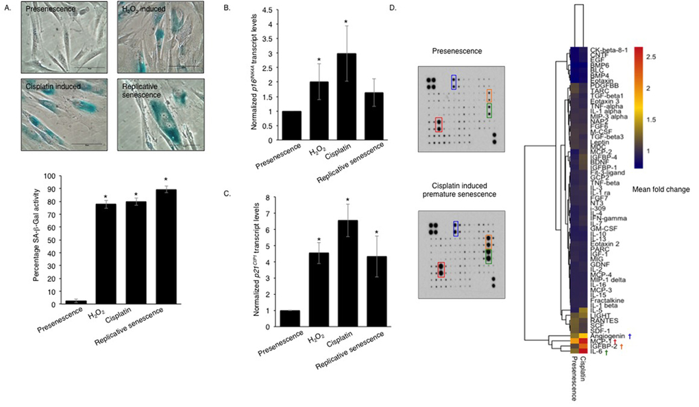 The soluble cytokines of SASP from cisplatin-treated and presenescent oral fibroblasts were determined by human cytokine antibody array 6 (Raybiotech). The signal intensities were quantified using 1D gel analysis software (BioRad).