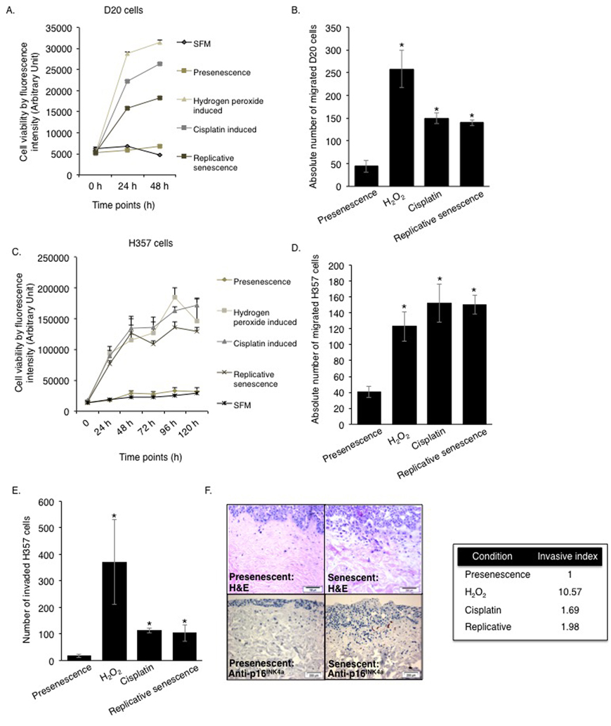 Although it has been reported that primary human oral fibroblasts are able to develop a senescence-associated secretory phenotype (SASP), the constituents of this have not previously been characterized and the ability of chemotherapeutics to induce the SASP in these cells has not been explored. In order to address these questions, fibroblasts were exposed to DNA damaging agents (H2O2 and cisplatin), or cultured to replicative senescence and the composition of the resulting secretome was analysed. Successful induction of senescence was demonstrated by positive senescence-associated (SA) β-galactosidase staining (Fig 1A), elevated p16INK4A levels (Fig 1B) and increased levels of p21CIP1 (Fig 1C). Analysis of conditioned media collected from prematurely senescent fibroblasts up to 15 days after induction of senescence revealed increased pro-matrix metalloproteinase 2 (pro-MMP2) activity (Fig S1A-C) and widespread alterations in the constituents of the SASP compared to proliferating controls (Fig 1D). Increased expression and secretion of IL-6 and MCP-1 in senescent cells were confirmed by qRT-PCR (except replicative senescence) and ELISA, respectively (Fig S1D-G). All secreted proteins were normalized to fibroblast cell density. Senescent fibroblasts also displayed increased α-SMA positive actin filaments compared to proliferating controls (Fig S1H). Conditioned media from senescent fibroblasts stimulated proliferation, chemotaxis and invasion of dysplastic (pre-malignant) keratinocytes and malignant epithelial cells (Fig 2A-E and Fig S2A-B). Incorporation of senescent fibroblasts into an organotypic model of the malignant oral mucosa [16] increased the invasive index of non-metastatic H357 [17] cancer cells (Fig 2F).