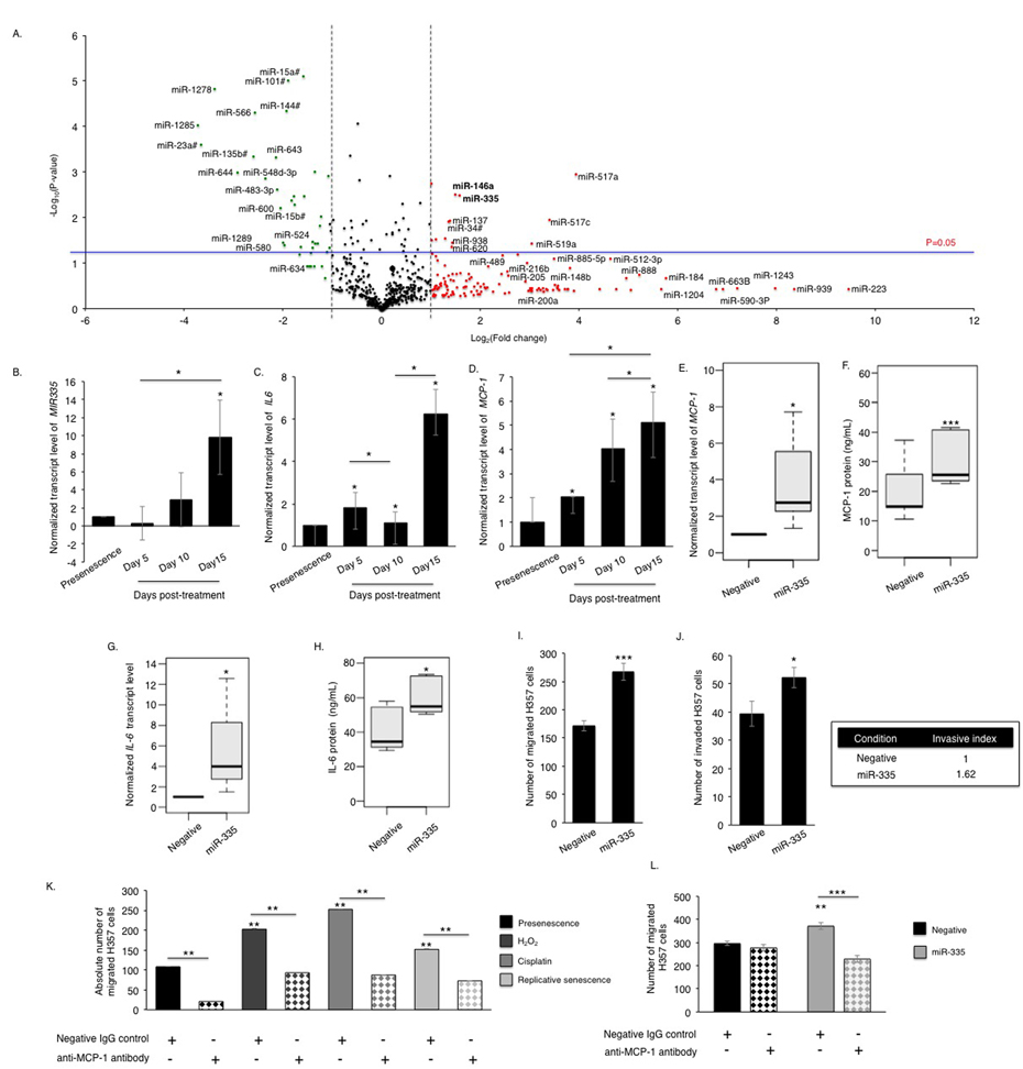 Profiling of cDNA synthesized from RNA extracted from senescent fibroblasts, 15 days after induction of senescence with cisplatin, revealed widespread changes in miRNA expression levels (Fig 3A and Table S1), including elevated miR-146a, a microRNA previously reported to be associated with secretion of inflammatory cytokines by senescent fibroblasts [18]. Following validation of changes in candidate miRNA expression in a number of cultures, and assessment of expression changes in fibroblasts induced to senesce by different stimuli (H2O2 and replicative exhaustion) by qPCR, miR-335-5p (thenceforth referred to as miR-335) was selected for further analysis (Fig S3A-C). Elevated levels of miR-335 were previously reported in aged human tissues and found conserved across species [19, 20]. Its over-expression induced premature ageing in human sarcoma cell lines and mesenchymal stem cells [21, 22]. We observed that miR-335 was significantly up-regulated in senescent fibroblasts irrespective of the method of senescence induction, and the time course of induction of miR-335 was in accordance to that of IL-6, MCP-1 and increased catalytic activity of MMP-2 (Fig 3B-D, Fig S1A), suggesting that miR-335 was a putative candidate as a regulator of SASP development. Accordingly, heterologous over-expression of miR-335 increased the expression and secretion of a panel of SASP markers including MCP-1 (rho=0.75, p-value=0.03), IL-6 (rho=0.95, p-value=0.0002) and MMP-2 (rho=0.7, p-value=0.035) (Fig 3E-H, Fig S3D). Over-expression of miR-335 in fibroblasts increased migration and invasion of malignant H357 cells in indirect co-culture (Fig 3I-J). No effect was observed on the acquisition of senescence assessed by the levels of p21CIP1 and p16INK4a (Fig S3E-F) and negative SA-β-Gal activity (data not shown), consistent with previous reports by Campisi and colleagues that senescence and the development of SASP are two independent events [14, 23]. As stromal MCP-1 has recently been reported to stimulate chemotaxis of oral cancer cells [24, 25], we examined the effects of functionally blocking MCP-1 in miR-335 overexpressing fibroblasts on the migration and invasion of cancer cells. Blockade of secreted MCP-1 in conditioned media from senescent fibroblasts significantly attenuated the migration and invasion of H357 cells (Fig 3K, Fig S3G). Blockade of secreted MCP-1 in conditioned media of proliferating fibroblasts also produced a profound reduction in migration and invasion of H357 cells in co-culture, suggesting MCP-1 also plays a role in communication between proliferating fibroblasts and cancer cells. Alternatively, it is also plausible that within the proliferating population there exists a subset of MCP-1 secreting senescent fibroblasts, which stimulate cancer cell migration. Inhibition of MCP-1 in conditioned media of oral fibroblasts over-expressing miR-335 significantly reduced chemotaxis of H357 cells compared to control cells transfected with a non-targeting synthetic miRNA (Fig 3L).