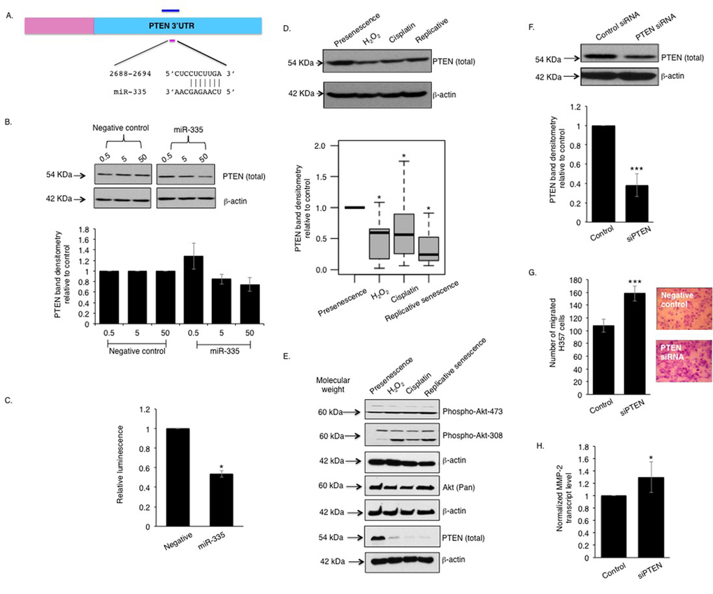 In silico pathway analysis revealed that the phosphoinositide 3-kinase (PI3-K) and Akt signaling pathway ranked highest amongst fifty other pathways and the genes interacting in this pathway are predicted to be targeted by twenty-eight of the differentially expressed miRNAs including miR-335 (Table S2, Fig S4A-B). PTEN, a regulator of PI3-K and Akt signalling previously reported to be involved in stromal-tumour interactions and senescence [26, 27], is a putative protein-coding target of miR-335, and of a number of other miRNAs identified as up-regulated in senescent cells displaying a robust SASP (Fig 4A, Table S3). Over-expression of miR-335 caused a dose-dependent decrease in PTEN protein levels in primary oral fibroblasts (Fig 4B) and suppressed luciferase expression from a construct containing the firefly luciferase coding region directly 5′ upstream of a fragment of the PTEN 3′UTR containing the putative binding sites for miR-335 (Fig 4C). Analysis of PTEN expression in senescent fibroblasts revealed a significant decrease compared to proliferating cells irrespective of the method of senescence induction (Fig 4D). This reduction was independently confirmed by RNA-seq analysis of transcriptomic changes in senescent fibroblasts compared to proliferating controls (Mellone et al, manuscript in submission). Increased Akt phosphorylation (indicative of reduced PTEN function) was also observed in senescent fibroblasts (Fig 4E). Transient knockdown of endogenous PTEN using siRNA enhanced the capacity of normal oral fibroblasts to stimulate chemotaxis of malignant cells in vitro (Fig 4F-G) accompanied by a significant increase in secretion of the SASP marker MMP-2 (Fig 4H) and a trend towards increasing IL-6 levels (p=0.360) (Fig S4C).