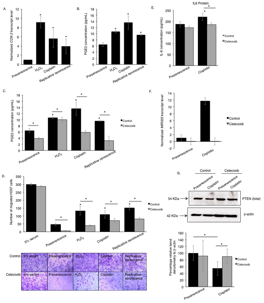 Elevated prostaglandin (PGE2) production by COX-2 is known to be a feature of senescent cells [28], and recombinant PGE2 can induce senescence in fibroblasts [28-30]. COX-2-regulation of the PTEN/Akt signalling is well documented in osteoblasts [31] but its role in fibroblasts is less well understood [32, 33]. The beneficial effects of using nonselective cyclooxygenase inhibitors in combination with chemotherapy [34] compelled us to examine whether COX-2 activity played a role in modulating the SASP in primary oral fibroblasts. We analyzed the levels of COX-2 transcript and the secreted product of its catalytic activity, PGE2, in fibroblasts induced to senesce by cisplatin or H2O2, and in replicative senescent cells. COX-2 transcripts were higher in senescent fibroblasts than proliferating controls and this was associated with elevated levels of secreted PGE2 in conditioned media isolated from senescent cells (Fig 5A-B). IL-6 is characterized as a COX-2-dependent cytokine necessary to activate numerous oncogenic signals acting downstream of COX-2 in cancer cells via activating STAT3 (signal transducer and activator of transcription 3) [35]. Selective inhibition of COX-2 activity with celecoxib in senescent fibroblasts significantly constrained the release of PGE2 and SASP component IL-6, and diminished chemotaxis of cancer cells in vitro to levels similar to those of untreated proliferating control (Fig 5C-E). Celecoxib also inhibited cancer cell migration towards conditioned media of proliferating fibroblasts to a greater extent than its senescent counterparts indicating the presence of other COX-2 and IL-6 independent SASP components in the conditioned media of senescent fibroblasts (Fig 5D, Fig S5A-B). Celecoxib neither induced senescence in proliferating fibroblasts nor altered SA β-activity of senescent fibroblasts (Fig S5C). In contrast celecoxib reduced expression of miR-335 in senescent fibroblasts compared to proliferating controls and this was associated with restoration of PTEN expression (Fig 5F-G).