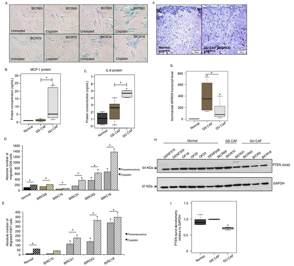 We have previously reported that CAF isolated from aggressive, genetically unstable, squamous cell carcinomas have a predominantly senescent phenotype [4]. We next utilized this knowledge to examine whether a COX-2/miR-335/PTEN signaling cascade contributes to the development of the SASP associated with senescent CAF as well as normal fibroblasts induced to senesce. Even though these CAF does not bear any genetic abnormalities and are diploid in nature [36] initially we investigated that the non-senescent CAF of genetically stable tumours (CAF/GS-OSCC) did not by-pass senescence by treating them with cisplatin. Treatment of senescent CAF from genetically unstable tumours (CAF/GU-OSCC) with cisplatin further reinforced SA β-galactosidase activity and induced senescence in non-senescent CAF from genetically stable tumours (CAF/GS-OSCC) (Fig 6A, Fig S6). Analysis of conditioned media collected from these cells revealed the senescent CAF/GU-OSCC released higher levels of MCP-1 and IL-6 than both non-senescent CAF/GS-OSCC and normal proliferating fibroblasts (Fig 6B-C). The senescent CAF/GU-OSCC were also able to induce more dysplastic and malignant cell migration and invasion than normal fibroblasts and non-senescent CAF/GS-OSCC, and this was augmented by cisplatin treatment (Fig 6D-F). Examination of SASP-associated miRNA by qRT-PCR revealed levels of miR-335 was significantly elevated in senescent CAF/GU-OSCC compared to normal proliferating fibroblasts (n=4). Non-senescent CAF/GS-OSCC also demonstrated a significant but highly variable elevation of miR-335 compared to normal fibroblasts (Fig 6G). Analysis of PTEN protein expression in CAF by western blot showed the senescent CAF/GU-OSCC expressed significantly less PTEN protein compared to the non-senescent CAF/GS-OSCC and normal fibroblasts (Fig 6H-I).