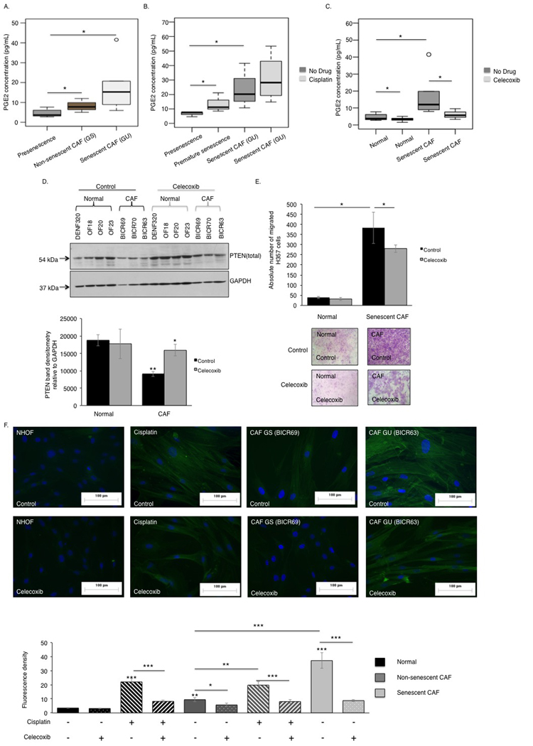 Determination of COX-2 activity in senescent CAF revealed COX-2 expression and PGE2 secretion was amplified in these cells compared to non-senescent-CAF and normal fibroblasts (Fig 7A). PGE2 levels were further increased by treating these cells with cisplatin (Fig 7B), and this increase was inhibited by celecoxib (Fig 7C). Celecoxib treatment restored PTEN levels in senescent CAF/GU-OSCC to approaching the levels in proliferating normal fibroblasts (Fig 7D). Chemotaxis of cancer cells towards conditioned media derived from celecoxib treated senescent CAF was reduced and the intensity of fluorescence signal from α-SMA positive stress fibers became attenuated and less conspicuous in these fibroblasts (Fig 7E-F).