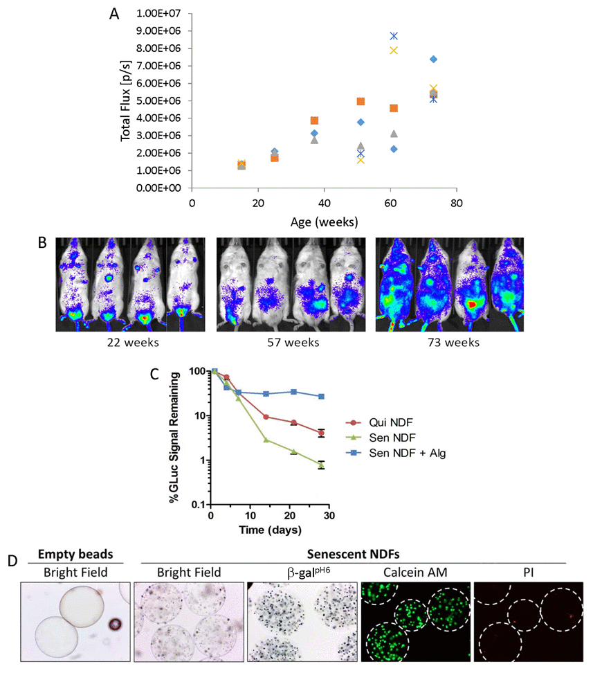 Senescent GLuc-expressing NDF were coated in alginate gel beads and injected into SCID mice. GLuc activity was monitored as an indicator of SC viability.