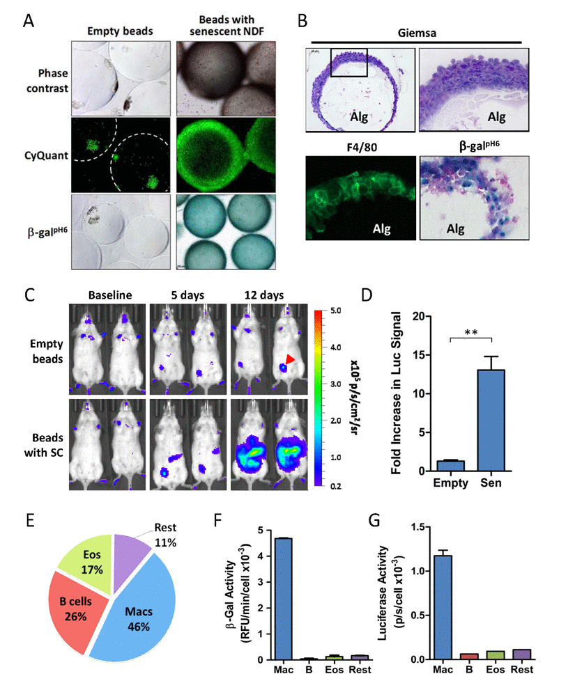 To study immune system components attracted by SC secretions, empty alginate beads or containing 1.5 million senescent NDF were inoculated into mice via intraperitoneal injection and harvested 14 days later, along with the intraperitoneal lavage, for the analysis of cellular content. Since similar results were obtained in SCID, NIH Swiss and C57BL/6 mice, here and below we only show data generated in C57BL/6.
