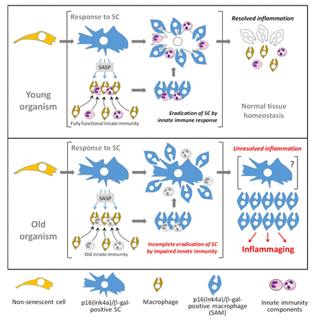 Although these data do not contradict the claimed role of SCs in aging, they call for a significant modification of this hypothesis. They point at a new type of cells, p16(Ink4a)/β-galpH6-positive macrophages, which also accumulate with age and were likely pharmacologically eradicated from the organisms of old mice in the experiments conducted by Baker et al. [21,23] and Demaria et al. [22]. Hence, this subpopulation of macrophages has the same right as SCs to be considered a possible contributor to aging. Obviously, the relative impact of either of these cell types to age-related inflammation remains to be determined.