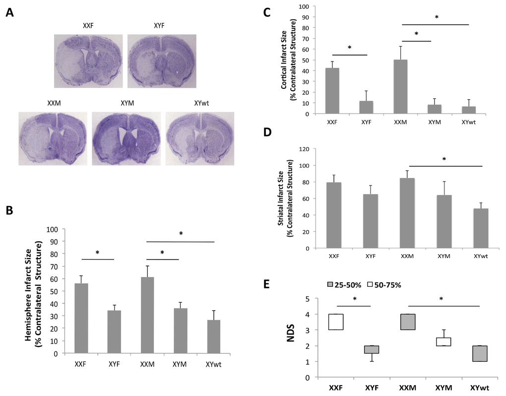 Clinically, ischemic stroke is recognized as a sexually dimorphic disease. Before menopause, women have a lower risk of stroke relative to men of the same age [1], uncovering a male phenotype of “ischemic-sensitivity” that has been attributed to the lack of the protective effects of estrogen (E2). After menopause, the incidence of stroke in women increases [2], coincident with diminished circulating levels of estrogens and progesterone. However, ischemic sexual dimorphism is not explained solely by circulating hormone levels. Stroke incidence in women does not begin to climb until decades after the natural menopause, suggesting there are hormone independent effects on ischemic sensitivity. Elderly women not only have higher stroke incidence than age-matched men, but also have poorer recovery, higher morbidity and mortality once a stroke occurs [3-7]. The mechanisms underlying these detrimental effects are unknown but may involve sex differences in inflammation that manifest with aging [8]. Modeling sex differences in the laboratory is difficult, as age and gonadal senescence contribute to outcomes [9]. The vast majority of pre-clinical stroke studies have used young animals with surgical gonadectomy to study sex differences. It is increasingly appreciated that tissue damage and functional outcomes after stroke are influenced by biologic sex in addition to the hormonal milieu [10-13]. The sex chromosome complement may contribute to sexual dimorphism; however earlier studies in young FCG mice found that hormones were the major contributor to stroke outcome [14]. Mice with ovaries that produced estrogen were protected, regardless of the sex chromosome compliment.