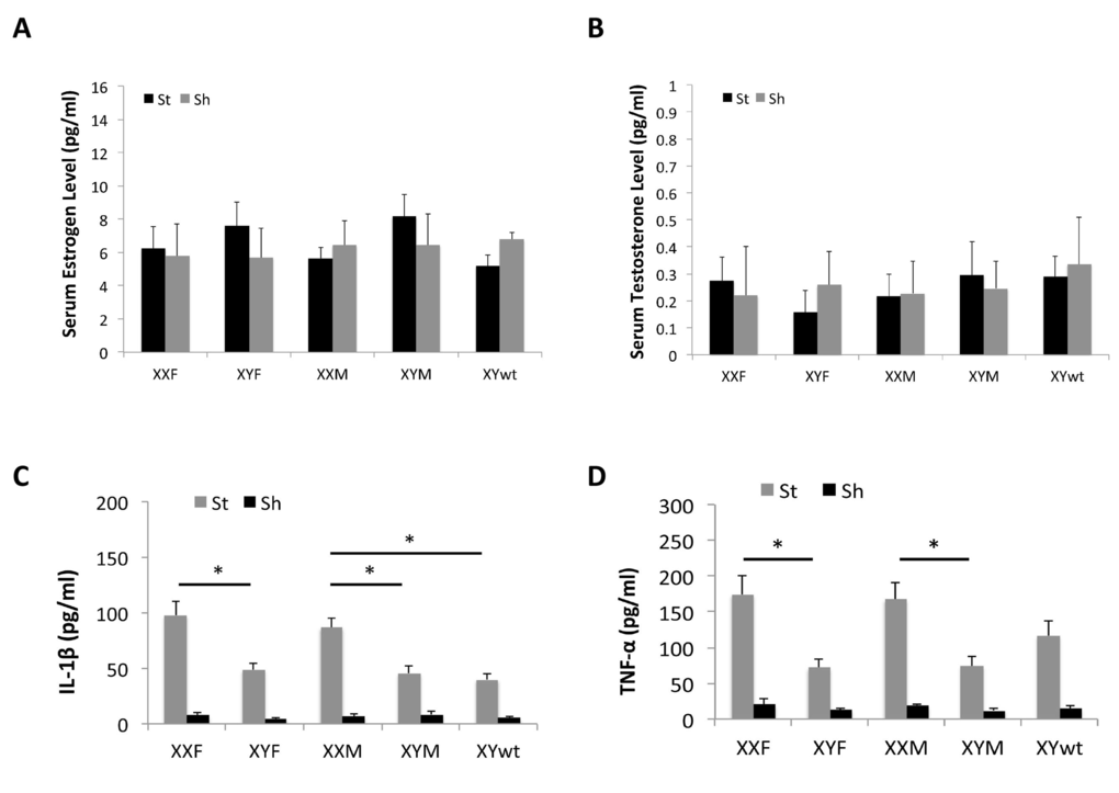Blood was extracted and centrifuged at 6,000 rpm for 10 minutes at 4°C. The supernatant was collected to isolate serum from the blood. Hormone levels were measured using ELISA kits for testosterone (#TE187S-100; Calbiotech) and estrogen (#BQ180S; BQ Kits). The serum concentration of TNF-α and IL-1β was determined by mouse TNF-α (#88-7324) and IL-1β (#88-7013) ELISA kits (eBioscience).