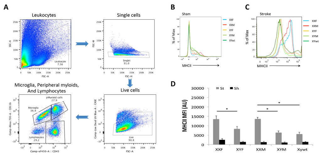 In order to determine if the differential cytokine profile seen in mice with a second X chromosome was secondary to sex differences in innate immunity in either the brain (microglia) or the periphery (monocytes and neutrophils) we examined infiltrating leukocytes in the ischemic brain by flow cytometry 3 days after stroke. The gating strategy is shown in Figure 4A. First we quantified microglia by gating on the CD45lowCD11b+ population [18]. We found no differences in the absolute number of microglia between any of the groups. Next we examined the expression of microglial MHC II that functions to promote innate immune responses and is frequently used as a pro-inflam-matory marker [19-22]. Mean fluorescence intensity (MFI) of MHC II was quantified to determine the activation status of microglia (Fig. 4B-D) as MFI of MHC II has been frequently measured as an indicator of phagocyte activation [23, 24]. All five strains had equivalent baseline MHC II expression in sham mice (Fig. 4B); however, MHC II was differentially expressed after stroke. XXF mice had significantly higher MHC II MFI than XYF mice, and the MFI in XXM group was significantly higher than that in either XYM or XYwt group (Fig. 4C&D), the same pattern seen in infarct volume.