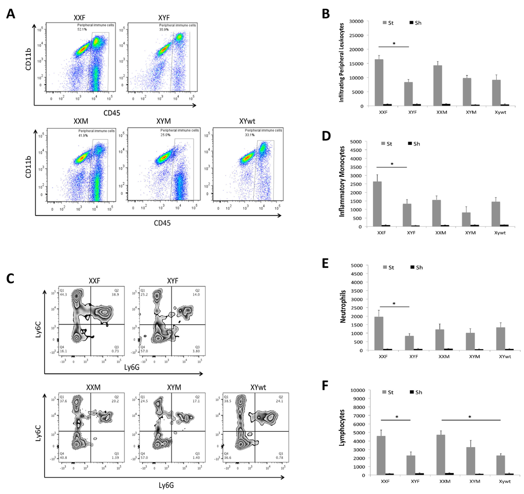 We also examined the composition of infiltrating leukocytes in the brain after stroke with flow cytometry 3 day after stroke. Peripheral immune cells (PIC) were defined as a CD45high population that includes monocytes, neutrophils and lymphocytes and the absolute number of PICs in the ischemic brain was quantified (Fig. 5A&B). XXF mice had significantly more PICs than XYF mice, and a similar pattern was seen between XXM and XYM/XYwt mice although the difference was not significant. Next each component of PICs was evaluated. As shown in Figure 4A, we first gated on peripheral myeloid cells (CD45highCD11b+), which were further gated to inflammatory monocytes (Ly6C+Ly6G−; Quadrant Q1 in Fig. 5C) and neutrophils (Ly6C+Ly6G+; Q2 in Fig. 5C). These two populations in XXF mice significantly outnumbered that in XYF mice. No significant difference was seen in XXM vs. XYM or XTwt groups (Fig. 5D&E). Lymphocytes were gated as in Figure 4A. The quantification data showed significantly more lymphocytes in XXF vs. XYF and in XXM vs. XYwt mice (Fig. 5A&F).