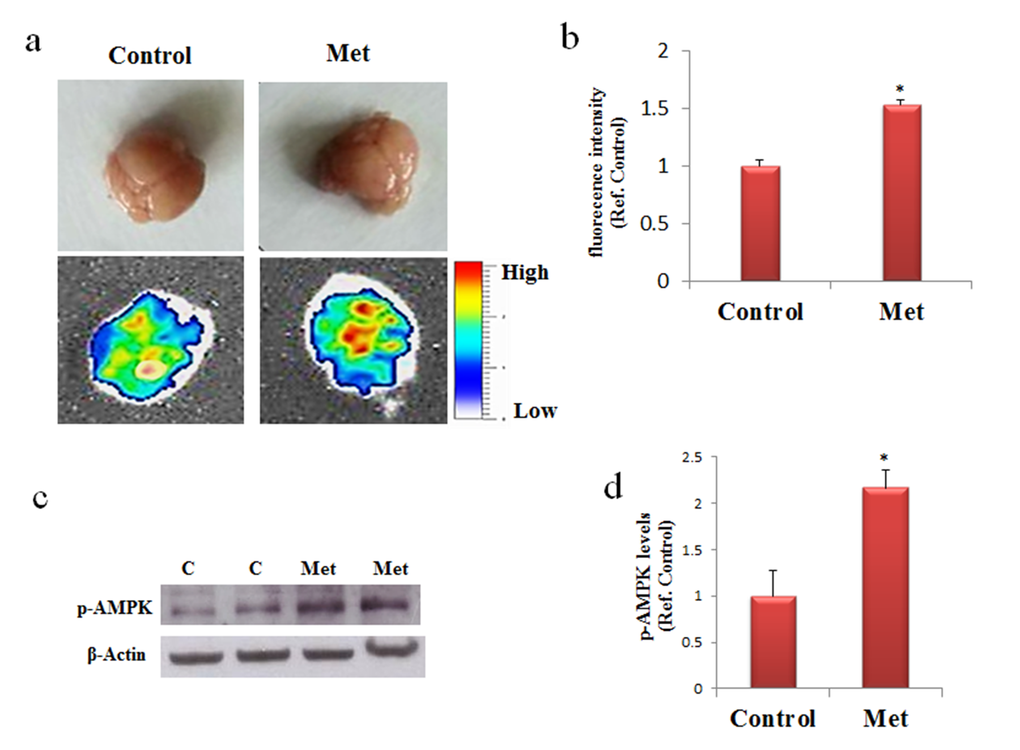 Absorption or fluorescence phenomena of ultraviolet or visible lights by a molecule depend on electron transitions between molecular orbital energy levels. Due to the presence of two double conjugated bonds the possibility of fluorescence phenomenon in metformin has been investigated. The emission spectrum obtained by fluorescence measurements indicates that metformin, once excited at 395 or 488 nm, has the emission peaks at 475 and 520 nm, respectively (data not shown). This property allows analyzing the presence of metformin into the brain of mice after its dispersion in drinking water. Metformin was administered to C57B6/J mice and after seven days the mice were sacrificed and the brains analyzed by using an imaging instrument. A strong signal was detected in the treated mice whereas no signal was found in the control, thus indicating that metformin has reached the brain (Fig. 1a,b). The delivery of metformin to the brain was confirmed by the increased levels of phosphorylated AMP-activated kinase (AMPK), one of the main molecular target of metformin (Fig. 1c,d). Thus, metformin crosses the blood brain barrier (BBB) and has an impact on the brain biochemical pathways.