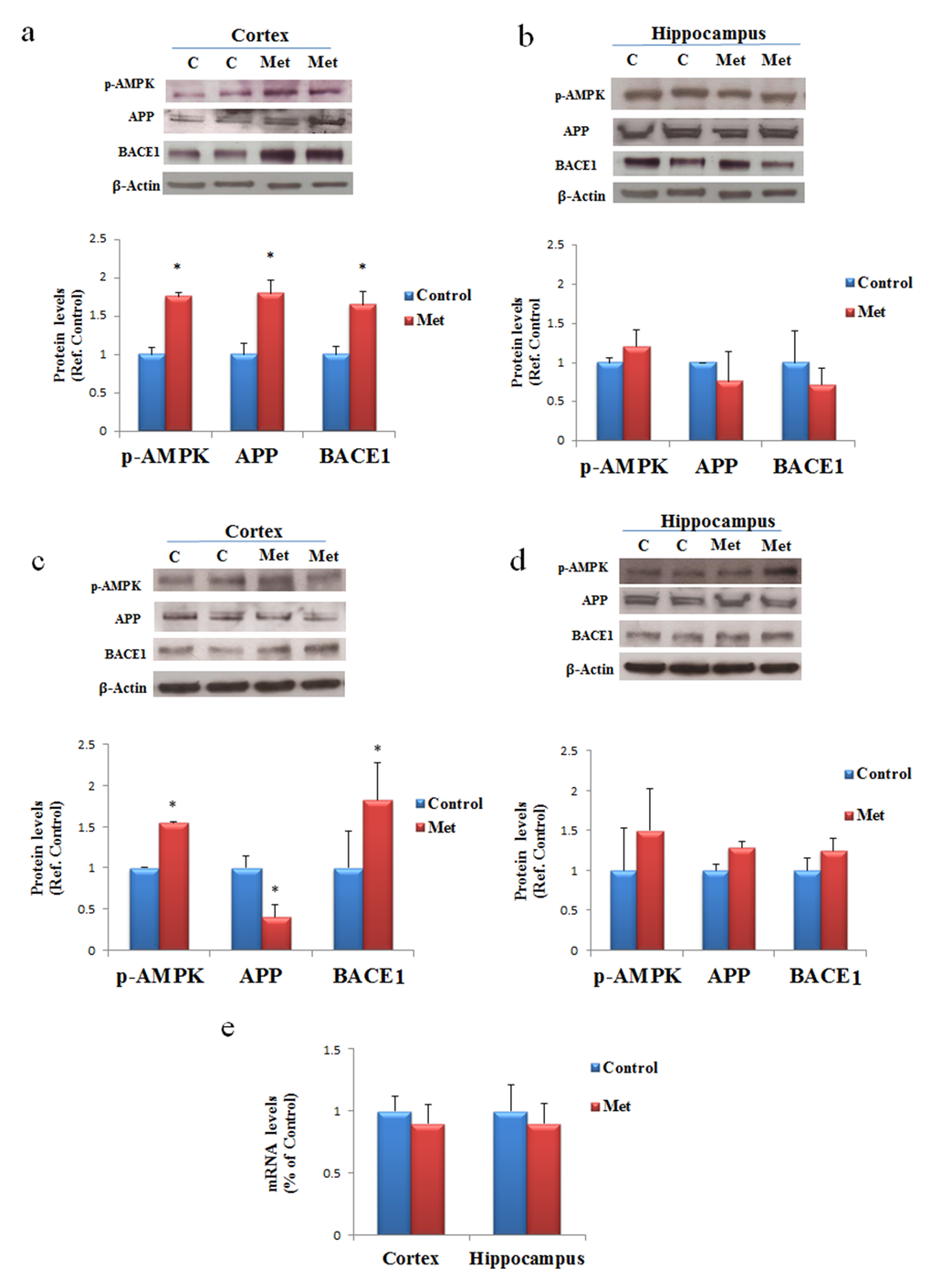 To ascertain the possibility that metformin is a risk factor for AD onset, especially in long term administration, C57B6/J mice were treated with metformin for seven days or three months. After these treatments proteins extracted from cortex and hippocampus, two-brain area mainly damaged in AD, were submitted to Western blot. Changes in the levels of BACE1, an enzyme required for APP processing to produce Aβ, its pathogenic cleavage product, and the same APP were measured. Activation of AMPK was evaluated for confirming the biochemical activity of metformin in the brain (Fig. 2). An increase of the levels of BACE1 and APP expression was detected in the cortex after seven days of treatment (Fig. 2a). In contrast, an increase of BACE1, and a decrease of APP were found after chronic treatment in the cortex, suggesting that an enhanced processing may be occurred (Fig. 2c). Furthermore, after both treatments, no significant differences in BACE1 and APP expression in the hippocampus were detected (Fig. 2b, d). To validate the hypothesis that the decreased presence of APP in the cortex was a consequence of the β-secretase increased activity, a quantitative real-time PCR (qRT-PCR) experiment was performed. No significant change was observed in APP transcript, strongly signifying that the produced protein was quickly processed (Fig. 2e).