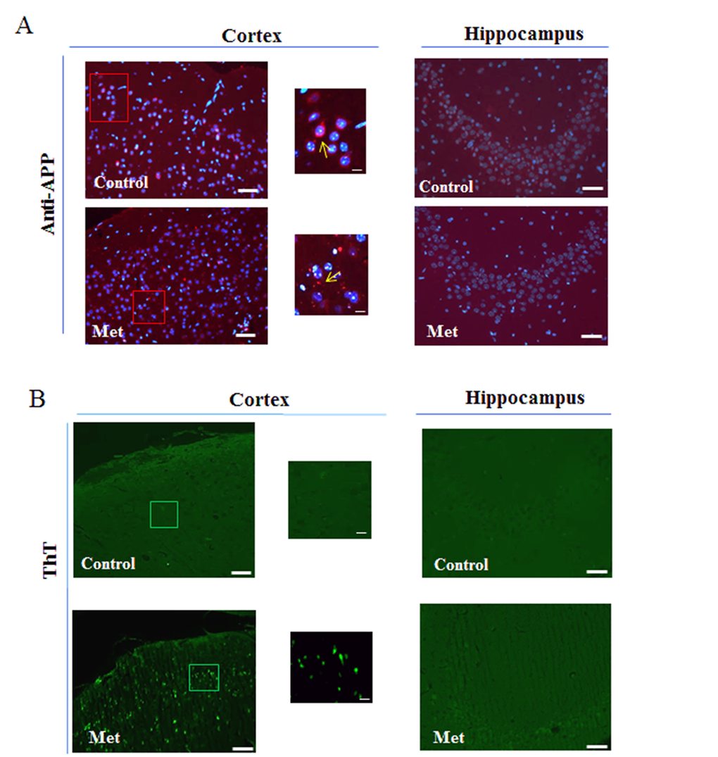 For Thioflavin-T (ThT) staining the brain sections including the cerebral cortex and the hippocampus were mounted on slides The slides were deparaffinized in xylene solution and hydrated in a series of graded ethanol (96%, 85%, 70%, 50%) for 5 minutes each. After washing in water, the sections were incubated in filtered 1% aqueous ThT solution for 8 minutes at room temperature. The slides were then dehydrated in ethanol 80% and 95%, for 5 minutes each. After washing in water the slides were mounted with cover slips and the images were visualized by using a Leica DM5000 upright microscope (Leica Microsystems, Heidelberg, Germany) at 20x magnification.