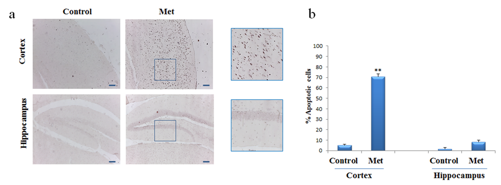 To assess whether, after chronic metformin treatment, apoptotic cell death occurred in vivo, presence of fragmented DNA was examined in cortex and hippocampus brain sections by the terminal deoxynucleotidyl transferase-mediated, dUTP, nick end labeling (TUNEL) method. TUNEL-positive cells in brain sections of metformin treated mice were markedly higher in cortical region than in hippocampal region or control (Fig. 5a, b).