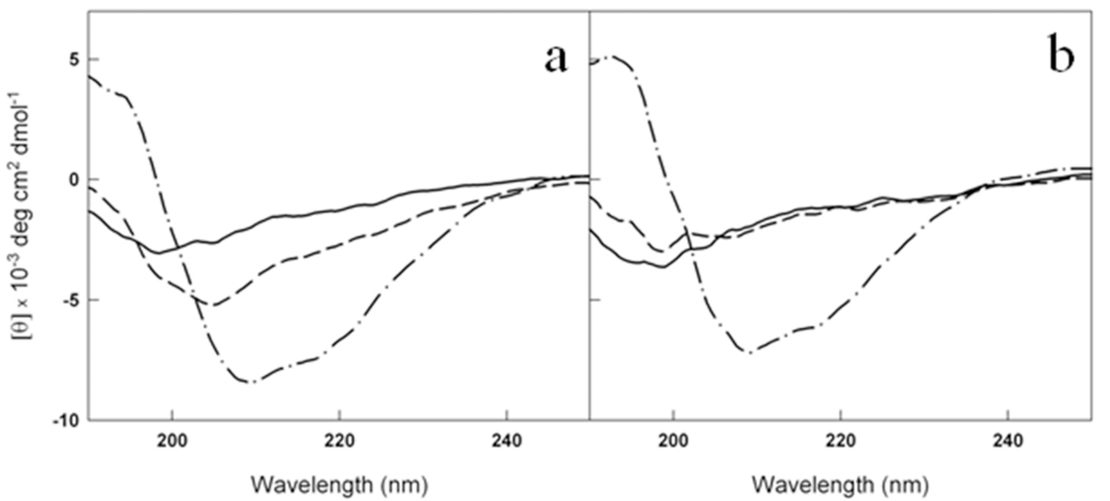 CD measurements were acquired by using a JASCO J-815 CD Spectrometer. Particularly, during the aggregation kinetics, withdrawals of samples at appropriate time were observed. Spectra were recorded at 20 °C using a quartz cell with 0.2 mm path length. Each spectrum measurement was obtained by averaging over eight scans and subtracting the blank solvent contribution.