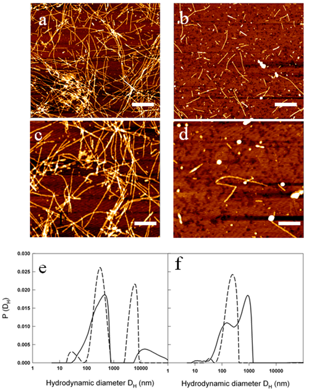 The characterization of the action of metformin on the aggregation process of Aβ1-40 peptide was followed by Dynamic Light Scattering (DLS) experiments. Although not specifically focused on chemico-physical features characterizing amyloid formation, like conversion to cross-β-structure, the addition of DLS to other biophysical techniques provides important quantitative information on the hydrodynamic size variation occurring during an aggregation process. In this sense, it represents a suitable technique to monitor the influence of an exogenous molecule on the protein assembly, and, therefore, it is often used for testing drugs for therapeutic purposes. Moreover, light scattering technique does not need the use of extrinsic probes, whose evaluation of their potential influence on the process under study requires high carefulness [40]. Figures 8e and f show the hydrodynamic diameter DH distribution functions of a sample of Aβ1-40 peptide undergone to the amyloid formation protocol (37°C and 200 rpm under stirring) with and without metformin, respectively after 0.5 h from the beginning of the process and at the end of the experiment observation (2 h). The increase in ThT assay (Fig. 6) and variation in CD spectra (Fig. 7) reveal that, at that time, in the absence of metformin a significant amyloid cross-β-structure has already formed. Correspondently, two size distributions are revealed by DLS analysis: one centered at around 300 nm and the other one corresponding to larger species of the order of microns. At the same time, in the presence of metformin this higher size species is not formed and only the appearance of species at around 300 nm occurs.